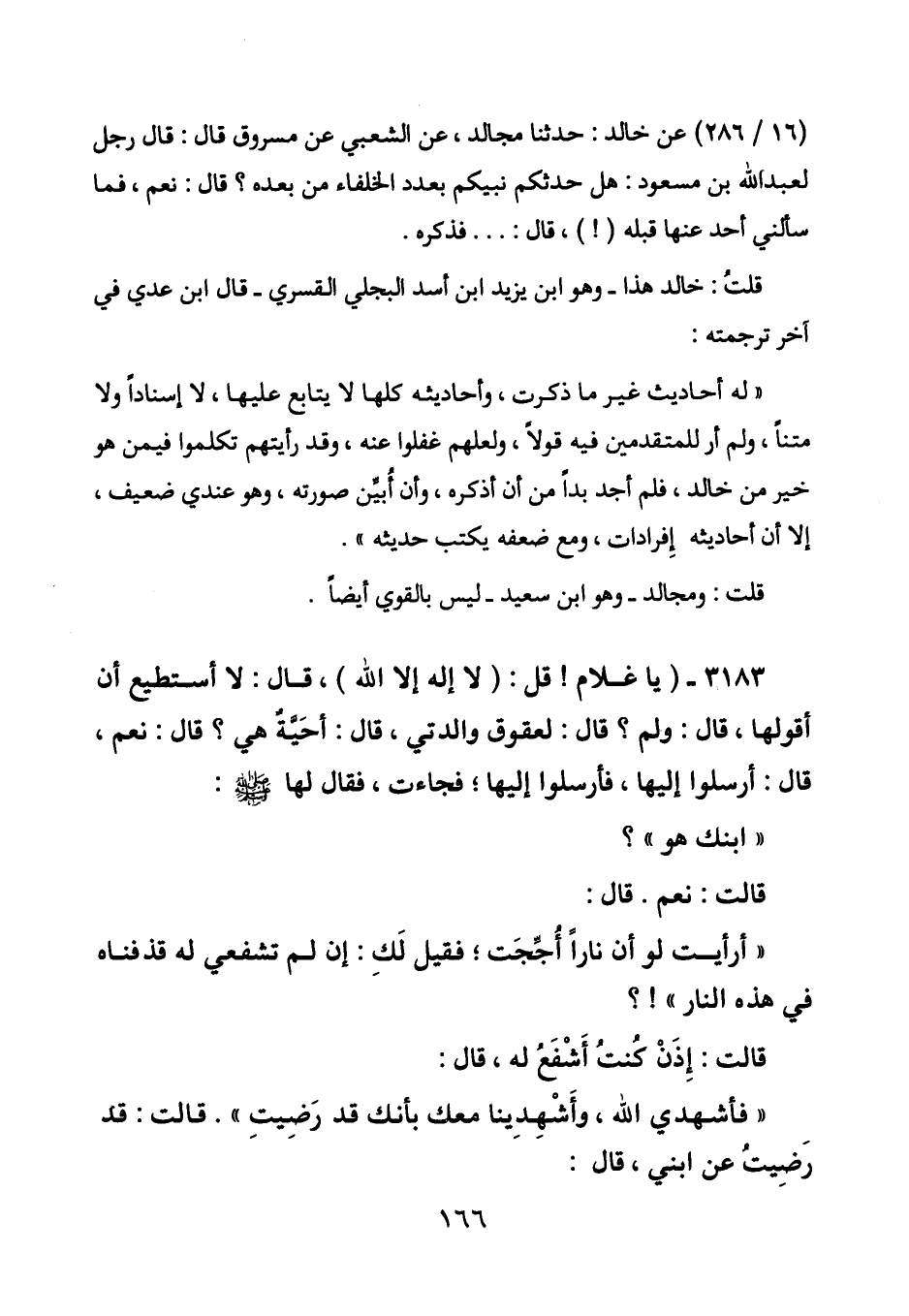 (16/ 286) عن خالد: حدثنا مجالد، عن الشعبي عن مسروق قال: قال رجل لعبد الله بن مسعود: هل حدثكم نبيكم بعدد الخلفاء من بعده، فما سألني أحد عنها قبله (!) ، قال: ... فذكره.