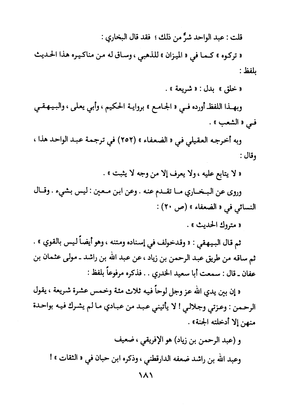 "إن بين يدي الله عز وجل لوحاً فيه ثلاث مئة وخمس عشرة شريعة، يقول الرحمن: وعزتي وجلالي! لا يأتيني عبد من عبادي ما لم يشرك فيه بواحدة منهن إلا أدخلته الجنة".