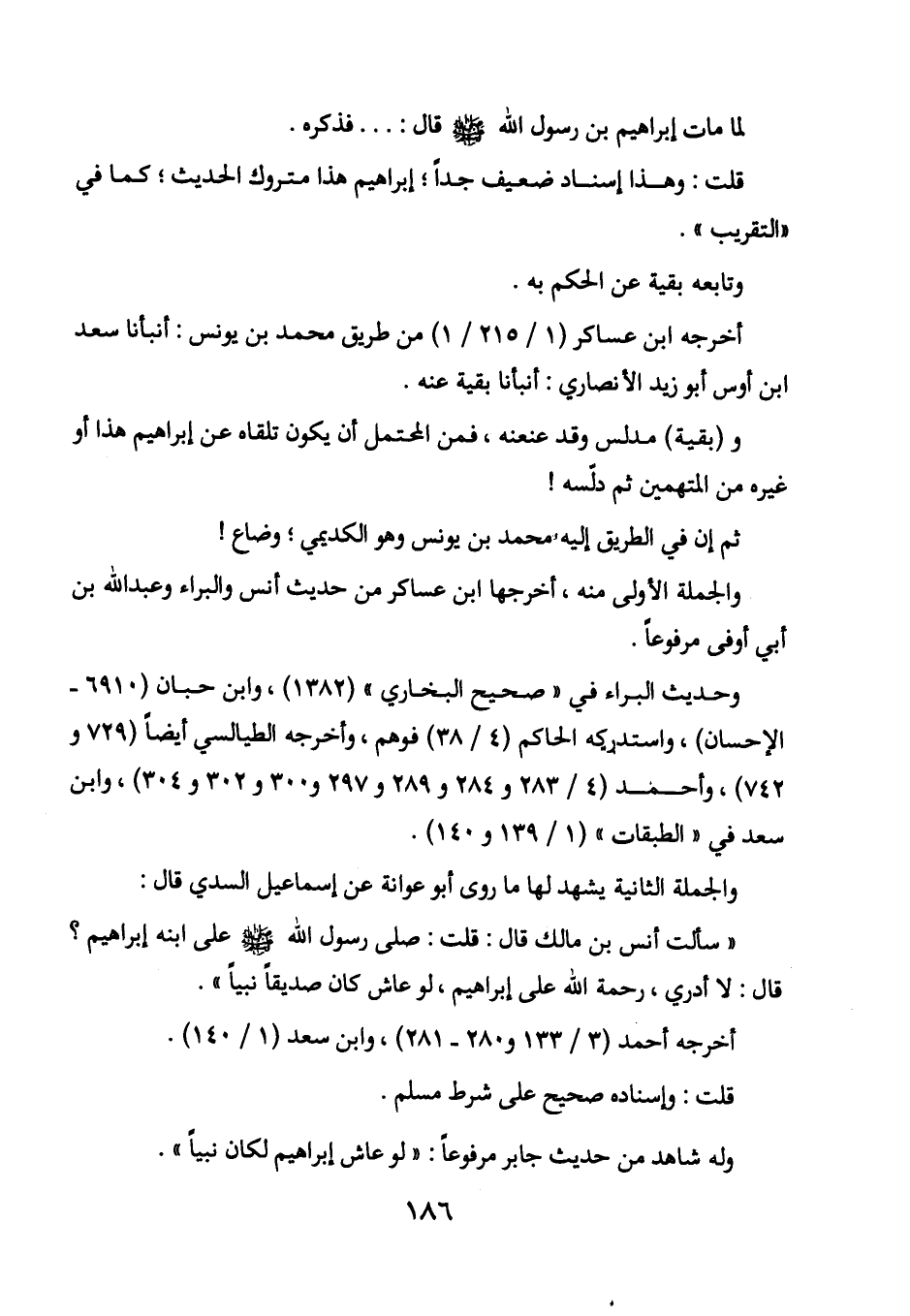 "سالت أنس بن مالك قال: قلت: صلى رسول الله - صلى الله عليه وسلم - على ابنه إبراهيم؟ قال: لا أدري، رحمة الله على إبراهيم، لو عاش كان صديقاً نبياً".