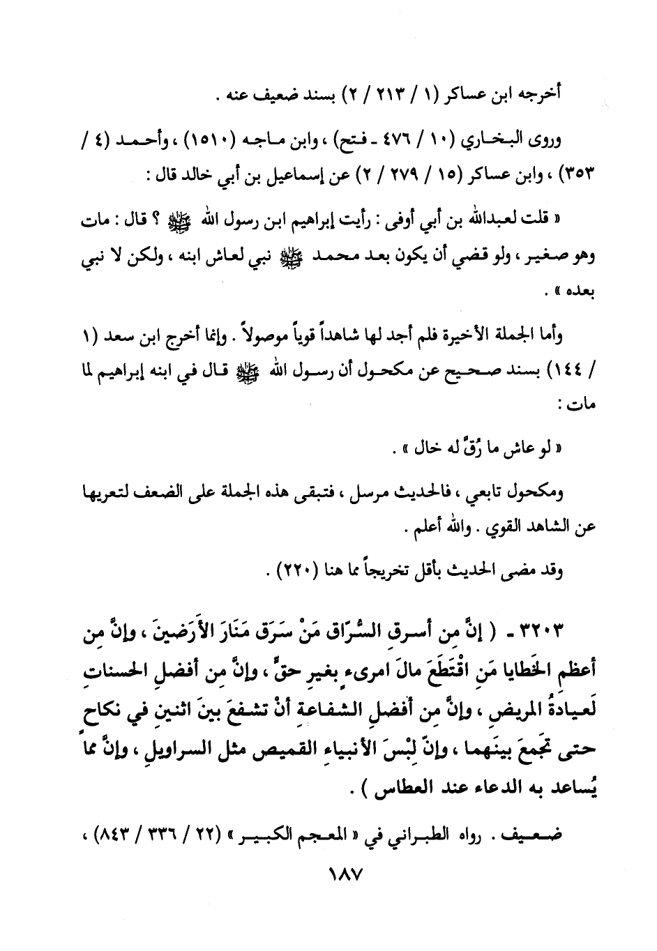 "قلت لعبد الله بن أبي أوفى: رأيت إبراهيم ابن رسول الله - صلى الله عليه وسلم -؟ قال: مات وهو صغير، ولو قضي أن يكون بعد محمد - صلى الله عليه وسلم - نبي لعاش ابنه، ولكن لا نبي بعده".