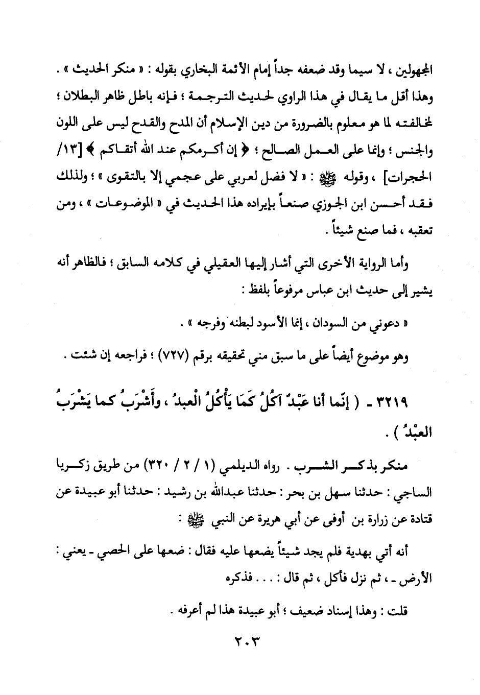 المجهولين، لا سيما وقد ضعفه جداً إمام الأئمة البخاري بقوله: "منكر الحديث". وهذا أقل ما يقال في هذا الراوي لحديث الترجمة؛ فإنه باطل ظاهر البطلان؛ لمخالفته لما هو معلوم بالضرورة من دين الإسلام أن المدح والقدح ليس على اللون والجنس؛ وإنما على العمل الصالح؛ (إن أكرمكم عند الله أتقاكم) [13/ الحجرات] ، وقوله - صلى الله عليه وسلم -: "لا فضل لعربي على عجمي إلا بالتقوي"؛ ولذلك فقد أحسن ابن الجوزي صنعاً بإيراده هذا الحديث في "الموضوعات"، ومن تعقبه، فما صنع شيئاً.