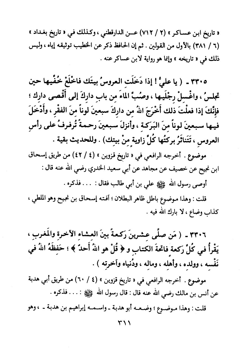 3305 - (يا علي! إذا دخلت العروس بيتك فاخلع خفيها حين تجلس، واغسل رجليها، وصب الماء من باب دارك إلى أقصى دارك، فإنك إذا فعلت ذلك أخرج الله من دارك سبعين لوناً من الفقر، وأدخل فيها سبعين لوناً من البركة، وأنزل سبعين رحمة ترفرف على رأس العروس، ثثناثر بركتها كل زاوية من بيتك) . وللحديث بقية.