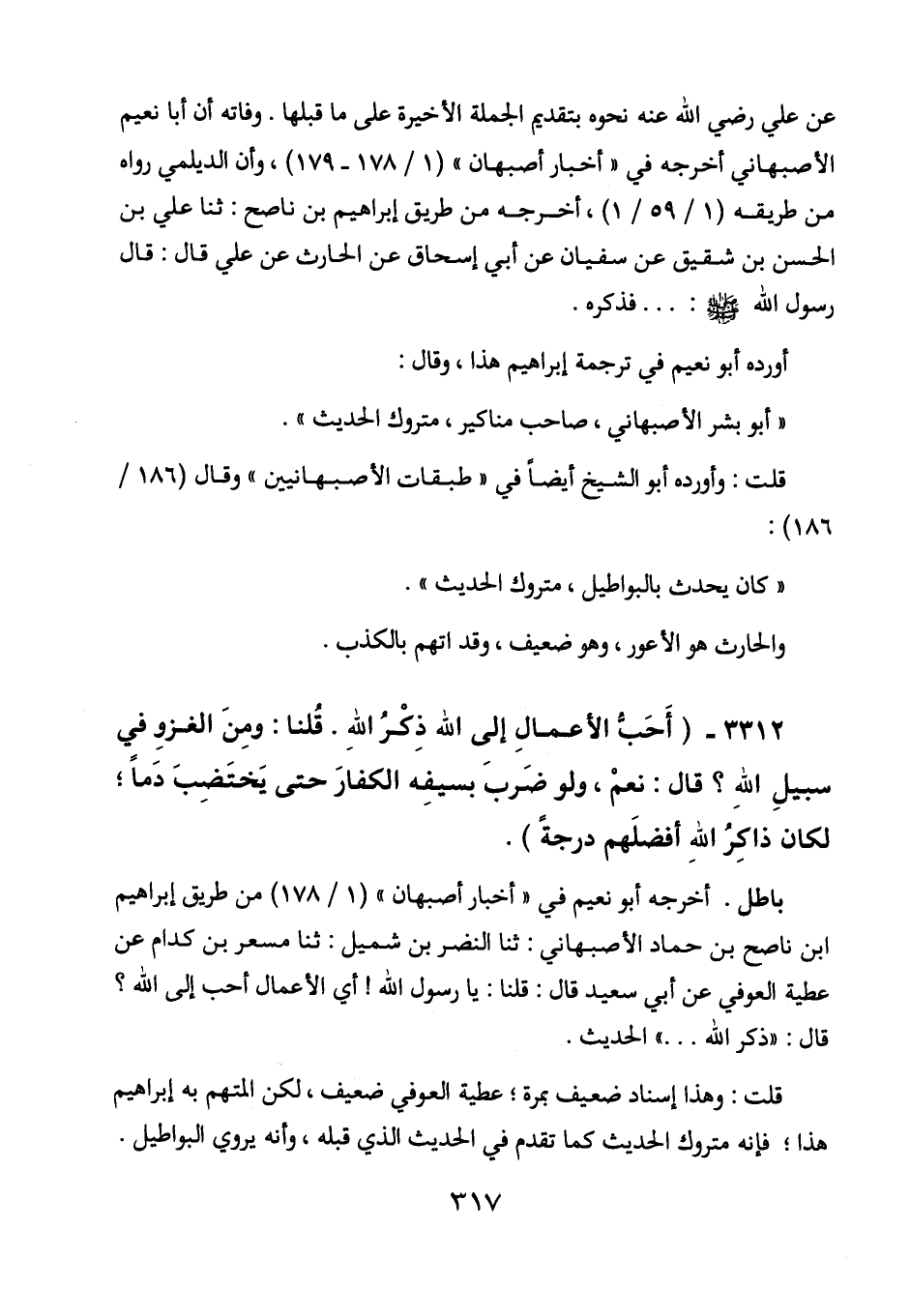 3312 - (أحب الأعمال إلى الله ذكر الله. قلنا: ومن الغزو في سبيل الله؟ قال: نعم، ولو ضرب بسيفه الكفار حتى يختصب دماً؛ لكان ذاكر الله أفضلهم درجة) .