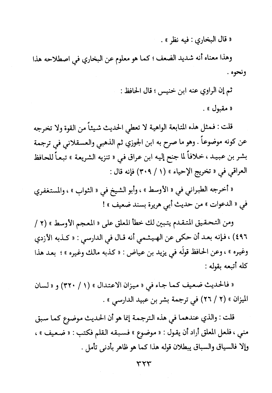 قلت: فمثل هذه المتابعة الواهية لا تعطي الحديث شيئاً من القوة ولا تخرجه عن كونه موضوعاً. وهو ما صرح به ابن الجوزي ثم الذهبي والعسقلاني في ترجمة بشر بن عبيد، خلافاً لما جنح إليه ابن عراق في "تنزيه الشريعة" تبعاً للحافظ العراقي في "تخريج الإحياء" (1/ 309) فإنه قال: