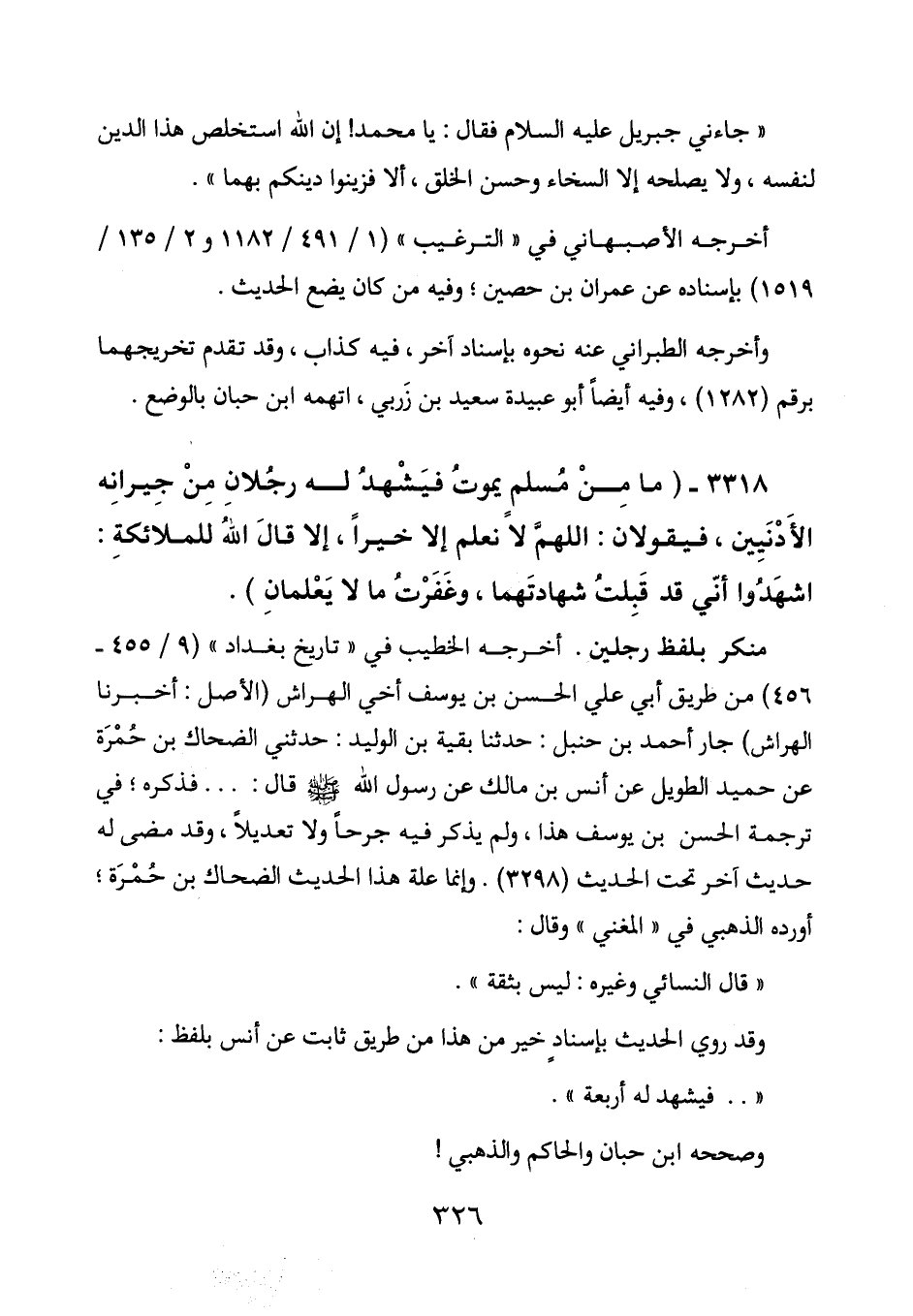 3318 - (ما من مسلم يموت فيشهد له رجلان من جيرانه الأدنيين، فيقولان: اللهم لا نعلم إلا خيراً، إلا قال الله للملائكة: اشهدوا أني قد قبلت شهادتهما، وغفرت ما لا يعلمان) .