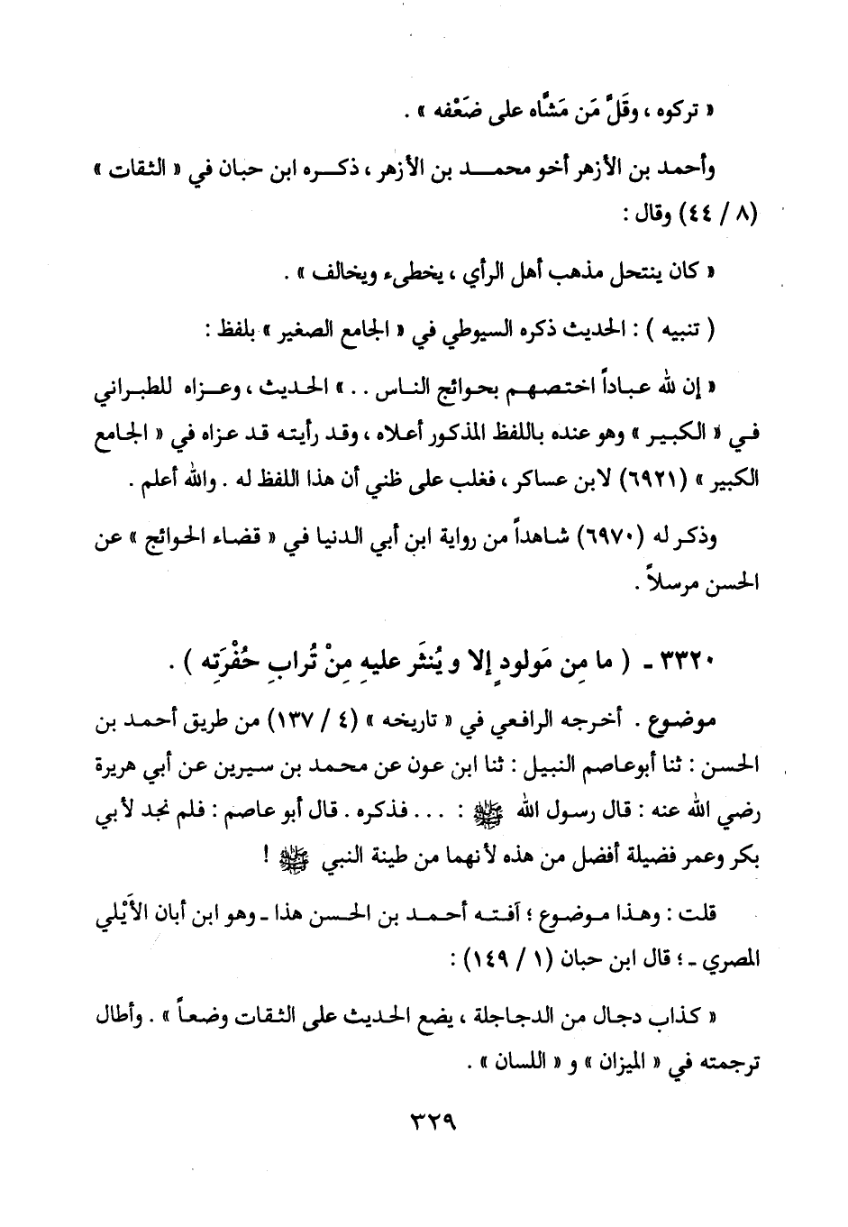 3320 - (ما من مولود إلا وينثر عليه من تراب حفرته) .