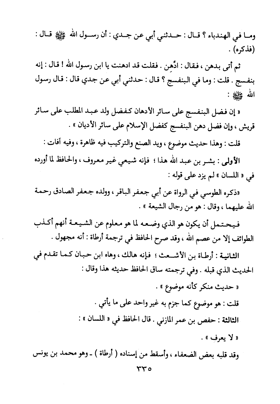 ثم أتى بدهن، فقال: ادهن. فقلت قد ادهنت يا ابن رسول الله! قال: إنه بنفسج. قلت: وما في البنفسج؟ قال: حدثني أبي عن جدي قال: قال رسول الله - صلى الله عليه وسلم -: