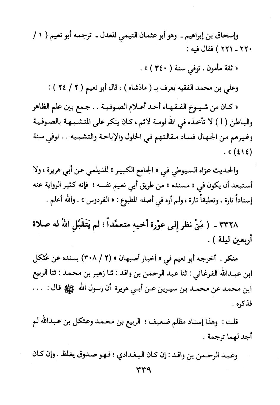 3328 - (من نظر إلى عورة أخيه متعمداً؛ لم يتقبل الله له صلاة أربعين ليلة) .