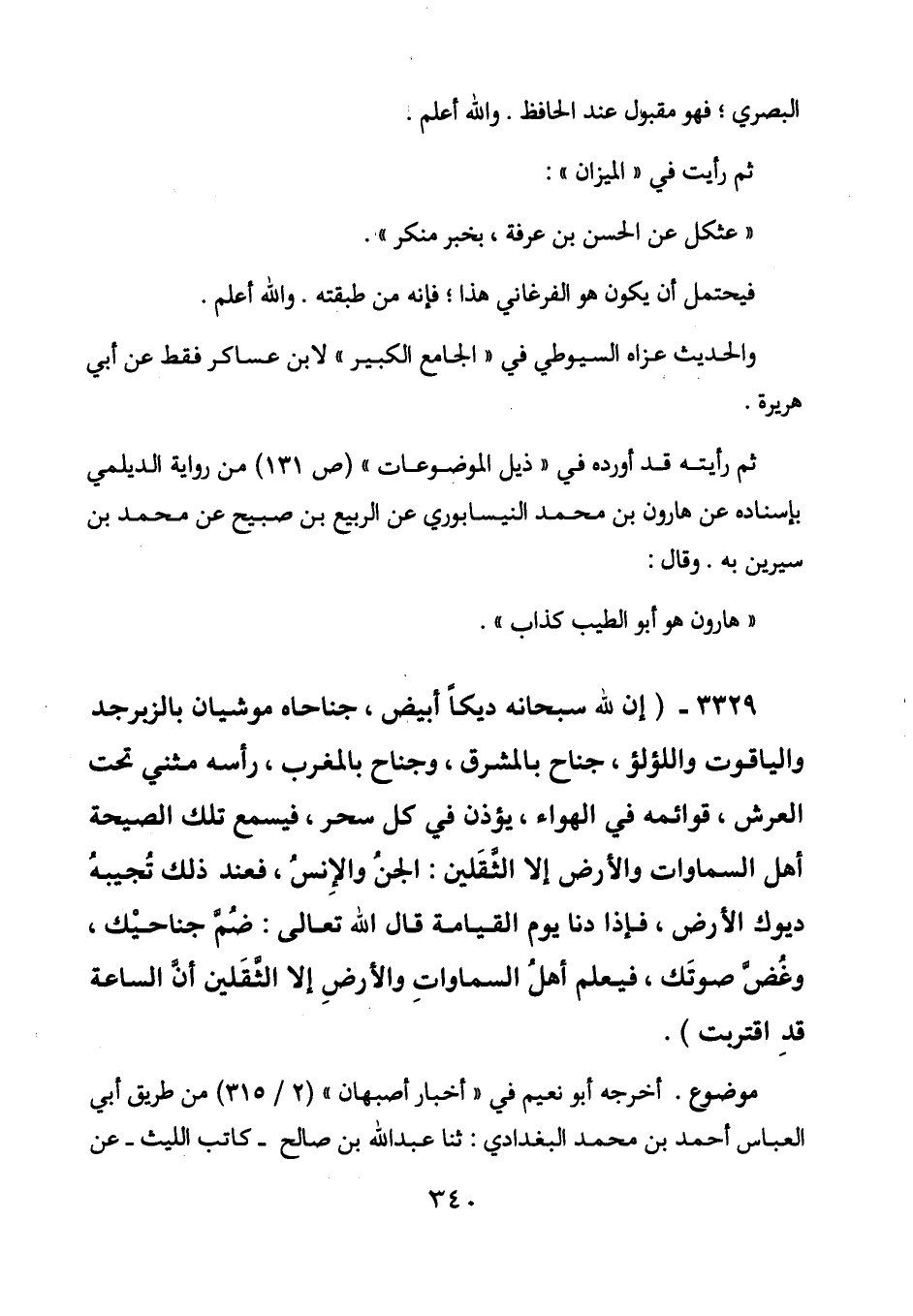 3329 - (إن لله سبحانه ديكاً أبيض، جناحاه موشيان بالزبرجد والياقوت واللؤلؤ، جناح بالمشرق، وجناح بالمغرب، رأسه مثني تحت العرش، قوائمه في الهواء، يؤذن في كل سحر، فيسمع تلك الصيحة أهل السماوات والأرض إلا الثقلين: الجن والإنس، فعند ذلك تجيبه ديوك الأرض، فإذا دنا يوم القيامة قال الله تعالى: ضم جناحيك، وغض صوتك، فيعلم أهل السماوات والأرض إلا الثقلين أن الساعة قد اقتربت) .