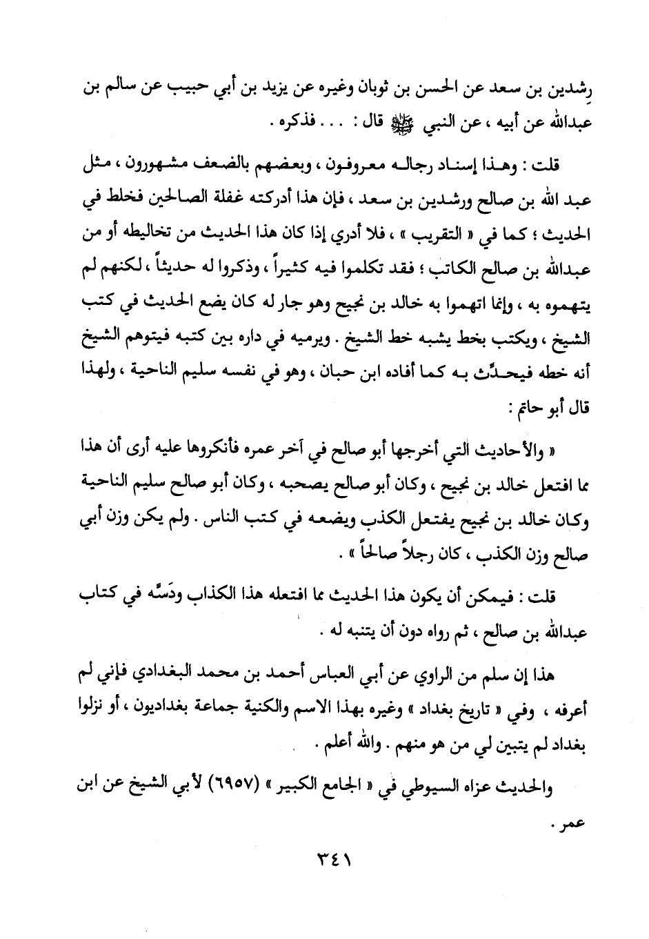 قلت: وهذا إسناد رجاله معروفون، وبعضهم بالضعف مشهورون، مثل عبد الله بن صالح ورشدين بن سعد، فإن هذا أدركته غفلة الصالحين فخلط في الحديث؛ كما في "التقريب"، فلا أدري إذا كان هذا الحديث من تخاليطه أو من عبد الله بن صالح الكاتب؛ فقد تكلموا فيه كثيراً، وذكروا له حديثاً، لكنهم لم يتهموه به، وإنما اتهموا به خالد بن نجيح وهو جار له كان يضع الحديث في كتب الشيخ، ويكتب بخط يشبه خط الشيخ. ويرميه في داره بين كتبه فيتوهم الشيخ أنه خطه فيحدث به كما أفاده ابن حبان، وهو في نفسه سليم الناحية، ولهذا قال أبو حاتم: