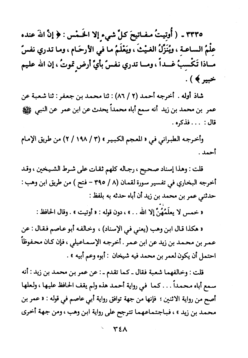 3335 - (أوتيت مفاتيح كل شيء إلا الخمس: (إن الله عنده علم الساعة، مينزل الغيث، ويعلم ما في الأرحام، وما تدري نفس ماذا تكسب غداً، وما تدري نفس بأي أرض تموت، إن الله عليم خبير)) .