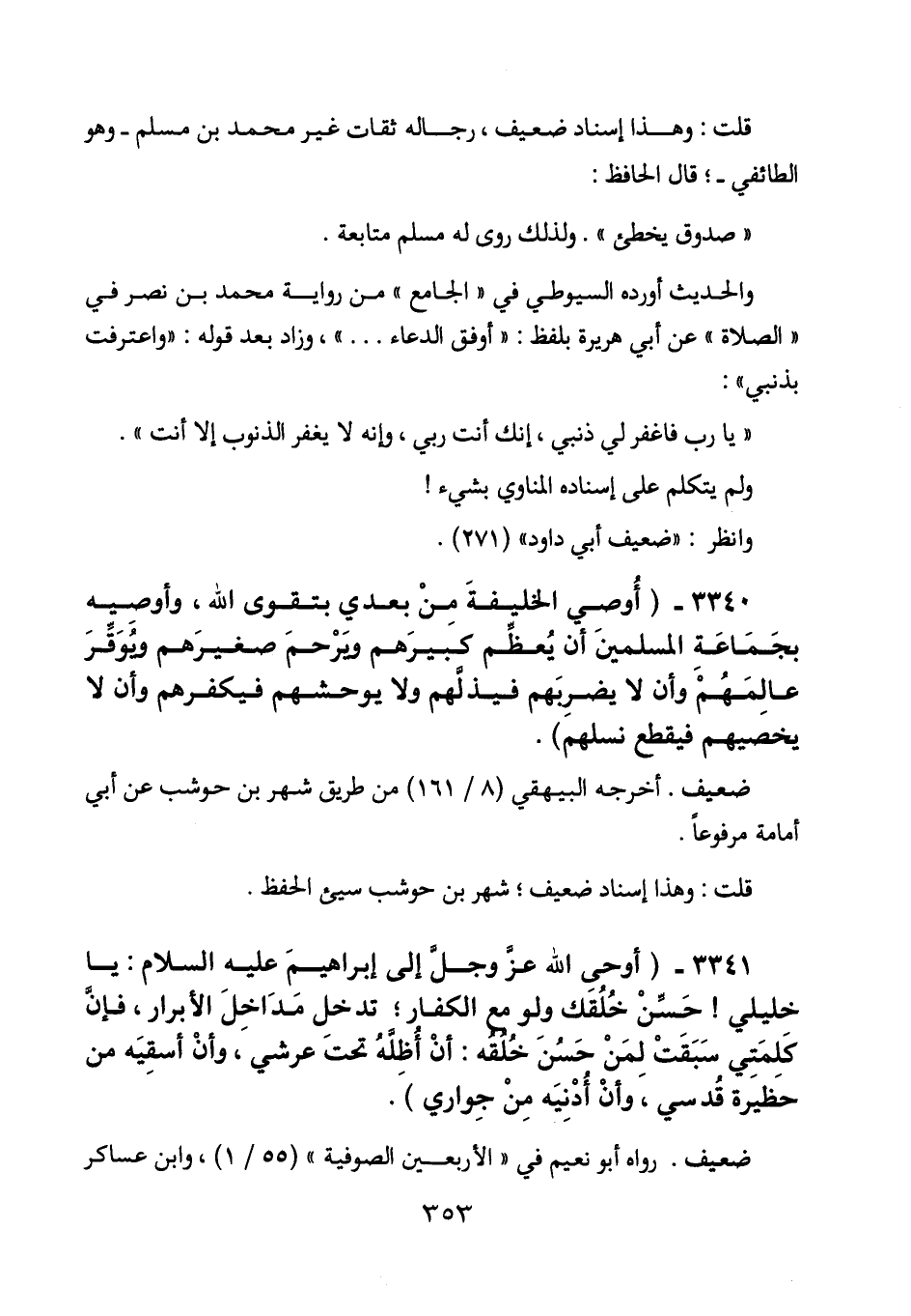 3340 - (أوصي الخليفة من بعدي بتقوى الله، وأوصيه بجماعة المسلمين أن يعظم كبيرهم ويرحم صغيرهم ويوقر عالمهم وأن لا يضربهم فيذلهم ولا يوحشهم فيكفرهم وأن لا يخصيهم فيقطع نسلهم) .