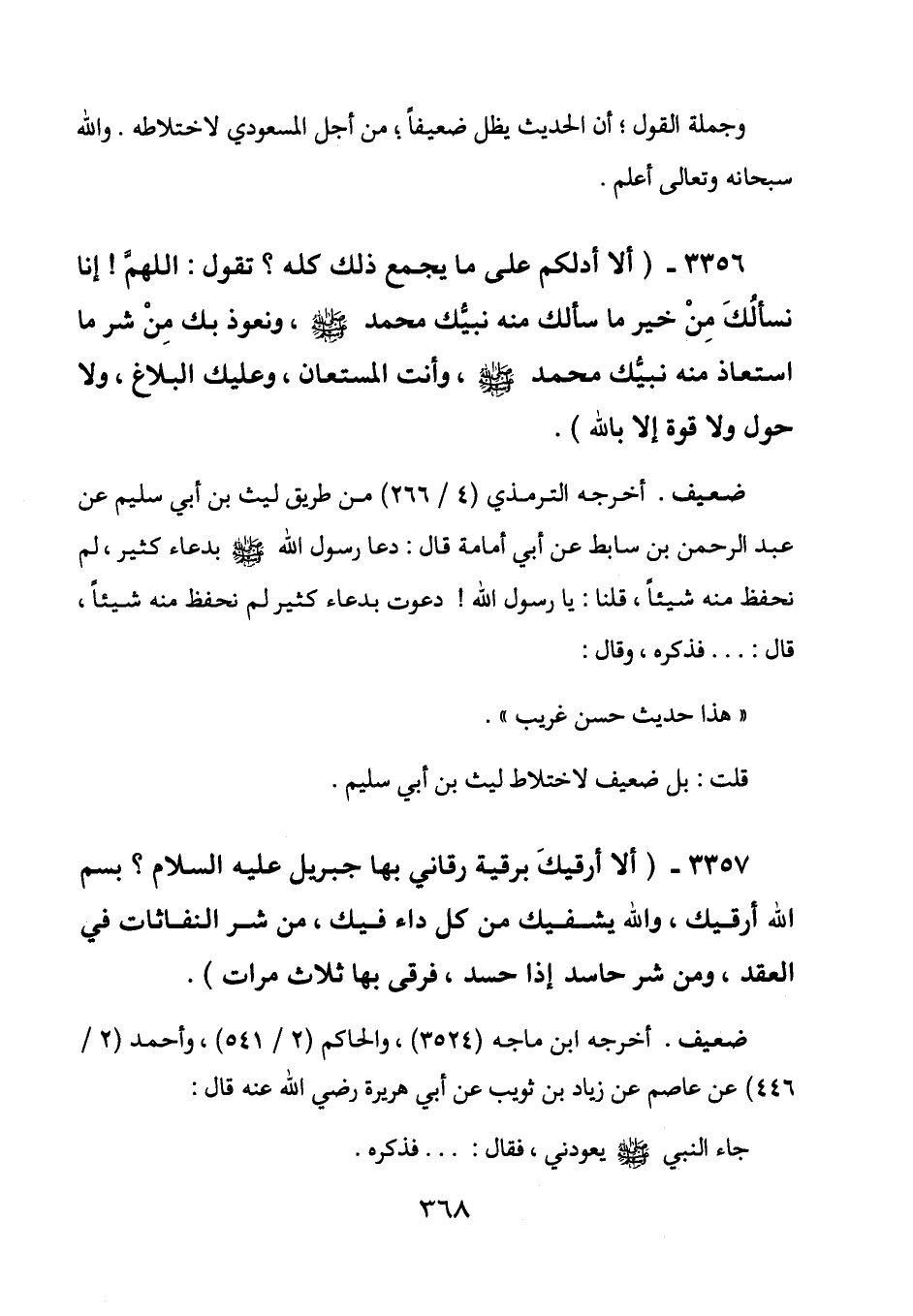 3357 - (ألا أرقيك برقية بها جبريل عليه السلام؟ بسم الله أرقيك، والله يشفيك من كل داء فيك، من شر النفاثات في العقد، ومن شر حاسد إذا حسد، فرقى بها ثلاث مرات) .