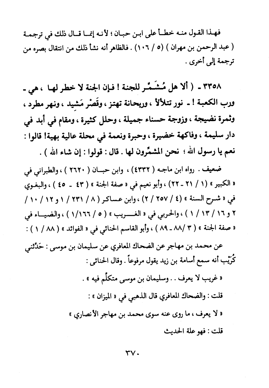 3358 - (ألا هل مشمر للجنة! فإن الجنة لا خطر لها، هي - ورب الكعبة! - نور تتلألأ، وريحانة تهتز، وقصر مشيد، ونهر مطرد، وثمرة نضيجة، وزوجة حسناء جميلة، وحلل كثيرة، ومقام في أبد في دار سليمة، وفاكهة خضيرة، وحبرة ونعمة في محلة عالة بهية! قالوا: نعم يا رسول الله؛ نحن المشمرون لها. قال: قالوا: إن شاء الله) .