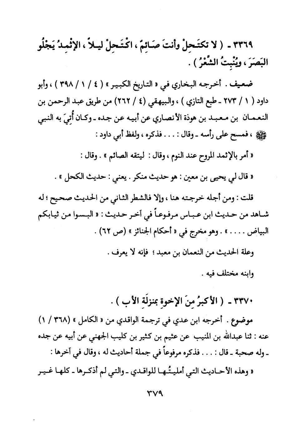 3369 - (لا تكتحل وأنت صائم، واكتحل ليلاً، الإثمد يجلو البصر، وينبت الشعر) .