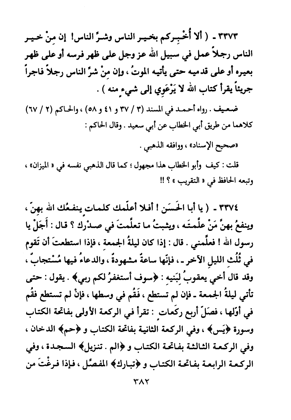 3374 - (يا أبا الحسن! أفلا أعلمك كلمات ينفعك الله بهن، وينفع بهن من علمته، ويثبت ما في صدرك؟ قال: أجل يا رسول الله! فعلمني. قال: إذا كان ليلة الجمعة، فإذا استطعت أن تقوم في ثلث الليل الآخر -، فإنها ساعة مشهودة، والدعاء فيها مستجاب، وقد قال أخي يعقوب لبنيه: (سوف أستغفر لكم ربي) . يقول: حتى تأتي ليلة الجمعة - فإن لم تستطع، فقم في وسطها، فإن لم تستطع فقم في أولها، فصل أربع ركعات: تقرأ في الركعة الأولى بفاتحة الكتاب وسورة (يس) ، وفي الركعة الثانية بفاتحة الكتاب و (حم) الدخان، وفي الركعة الثالثة بفاتحة الكتاب و (الم. تنزيل) السجدة، وفي الركعة الرابعة بفاتحة الكتاب و (تبارك) المفصل، فإذا فرغت من