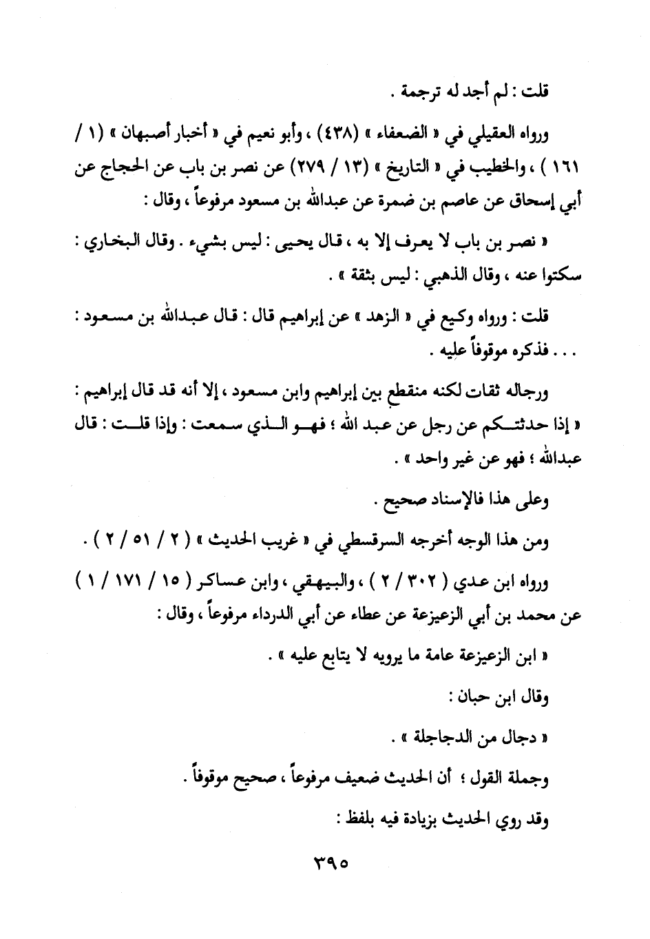 ورواه العقيلي في "الضعفاء" (438) ، وأبو نعيم في "أخبار أصبهان" (1/ 161) ، والخطيب في "التاريخ" (13/ 279) عن نصر بن باب عن الحجاج عن أبي إسحاق عن عاصم بن ضمرة عن عبد الله بن مسعود مرفوعاً، وقال: