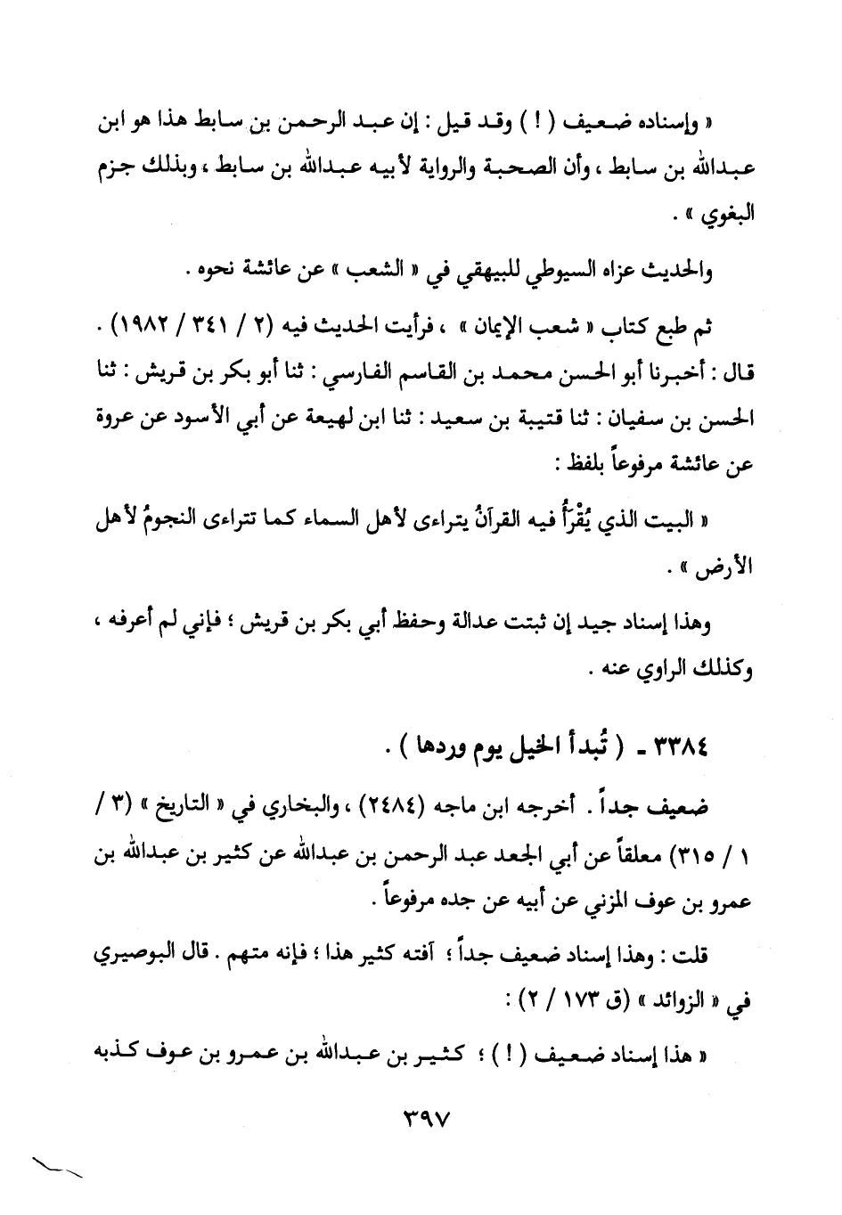 "وإسناده ضعيف (!) وقد قيل: إن عبد الرحمن بن سابط هذا هو ابن عبد الله بن سابط، وأن الصحبة والرواية لأبيه عبد الله بن سابط، وبذلك جزم البغوي".