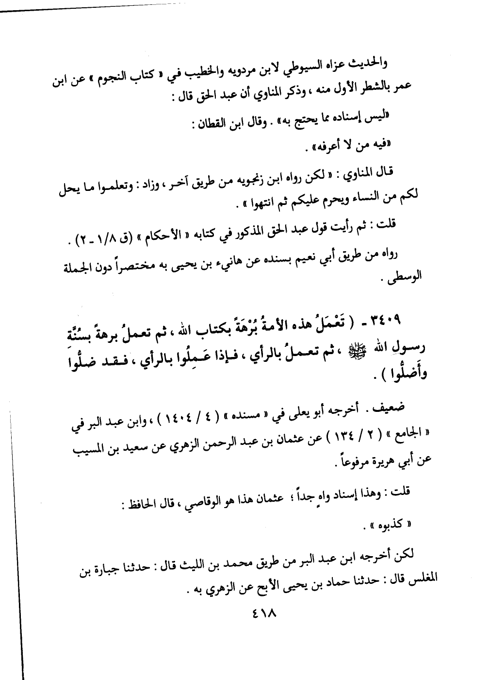 3409 - (تعمل هذه الأمة برهة بكتاب الله، ثم تعمل برهة بسنة رسول الله - صلى الله عليه وسلم -، ثم تعمل بالرأي، فإذا عملوا بالرأي، فقد ضلوا وأضلوا) .