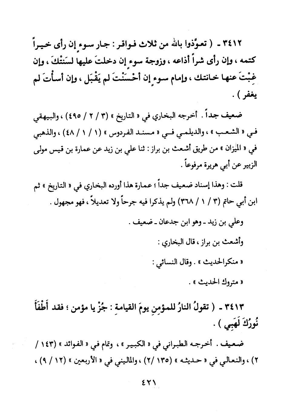 3413 - (تقول النار للمؤمن يوم القيامة: جز يا مؤمن؛ فقد أطفأ نورك لهبي) .