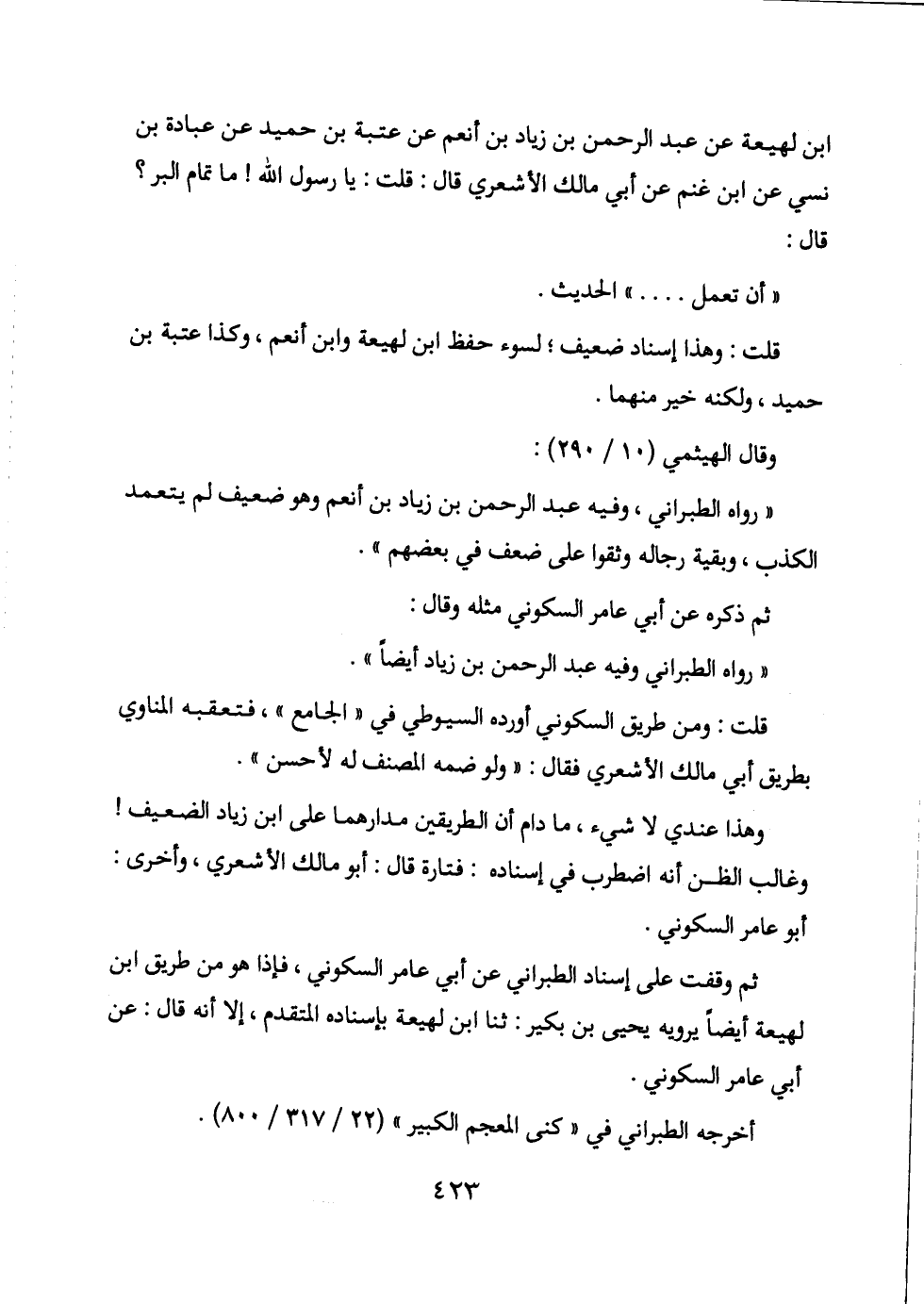 ابن لهيعة عن عبد الرحمن بن زياد بن أنعم عن عتبة بن حميد عن عبادة بن نسي عن ابن غنم عن أبي مالك الأشعري قال: قلت: يا رسول الله! ما تمام البر؟ قال: