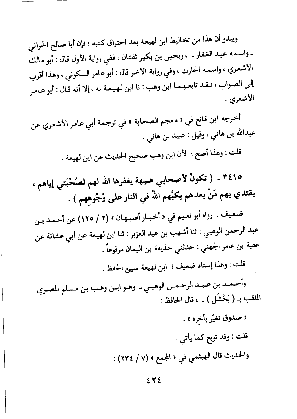 3415 - (تكون لأصحابي هنيهة يغفرها الله لهم لصحبتي إياهم، يقتدي بهم من بعدهم يكبهم الله في النار على وجوههم) .