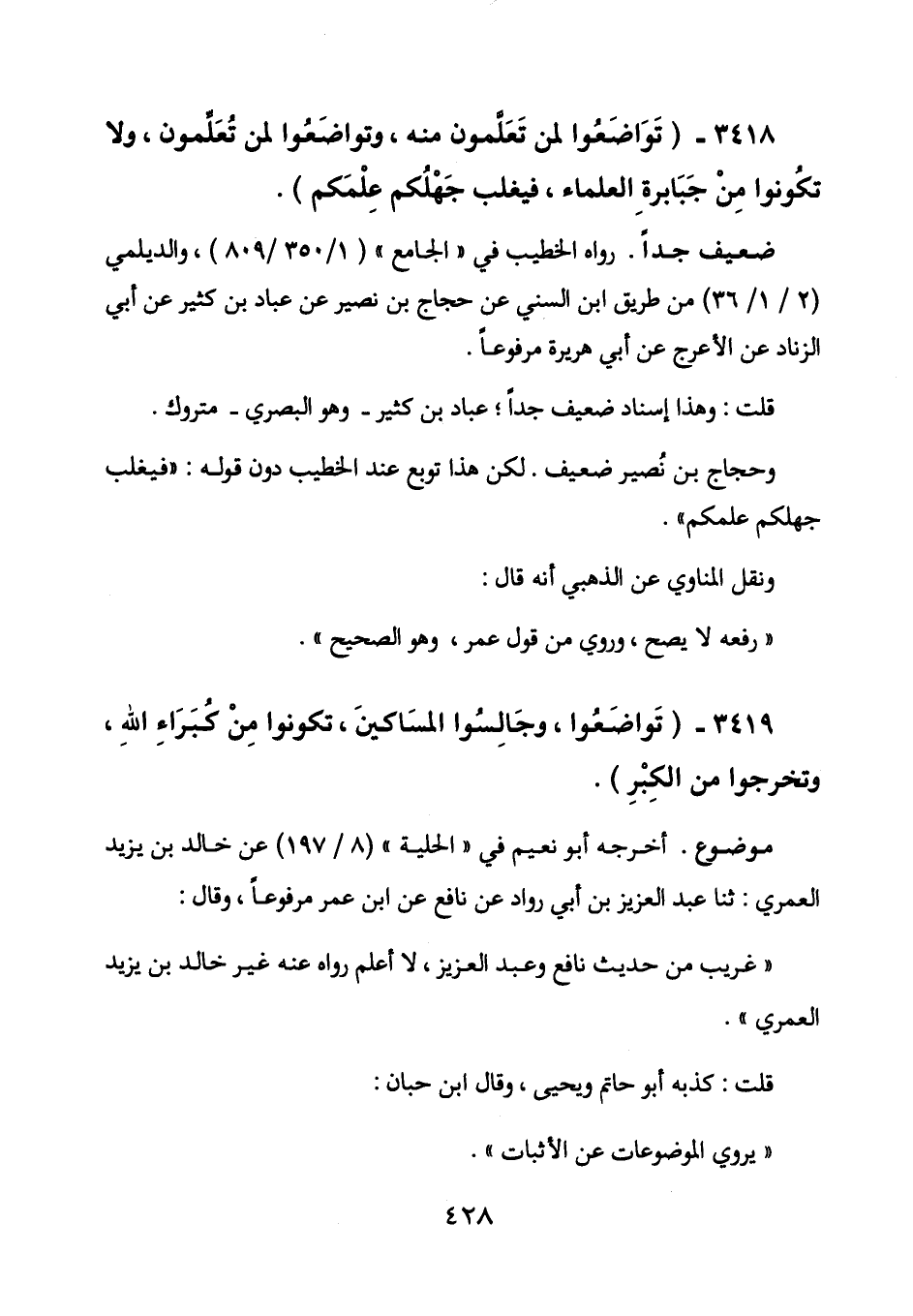 3418 - (تواضعوا لمن تعلمون منه، وتواضعوا لمن تعلمون، ولا تكونوا من جبابرة العلماء، فيغلب جهلكم علمكم) .