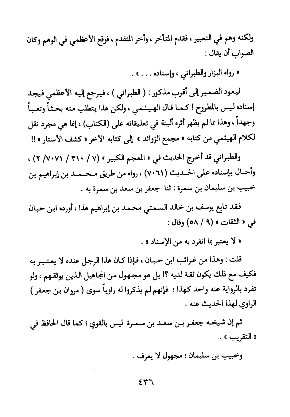 ليعود الضمير إلى أقرب مذكور: (الطبراني) ، فيرجع إليه الأعظمي فيجد إسناده ليس بالمطروح! كما قال الهيثمي، ولكن هذا يتطلب منه بحثاً وتعباً وجهداً، وهذا مما لم يظهر أثره ألبتة في تعليقاته على (الكتاب) ، إنما هي مجرد نقل لكلام الهيثمي من كتابه "مجمع الزوائد" إلى كتابه الآخر "كشف الأستار"!!