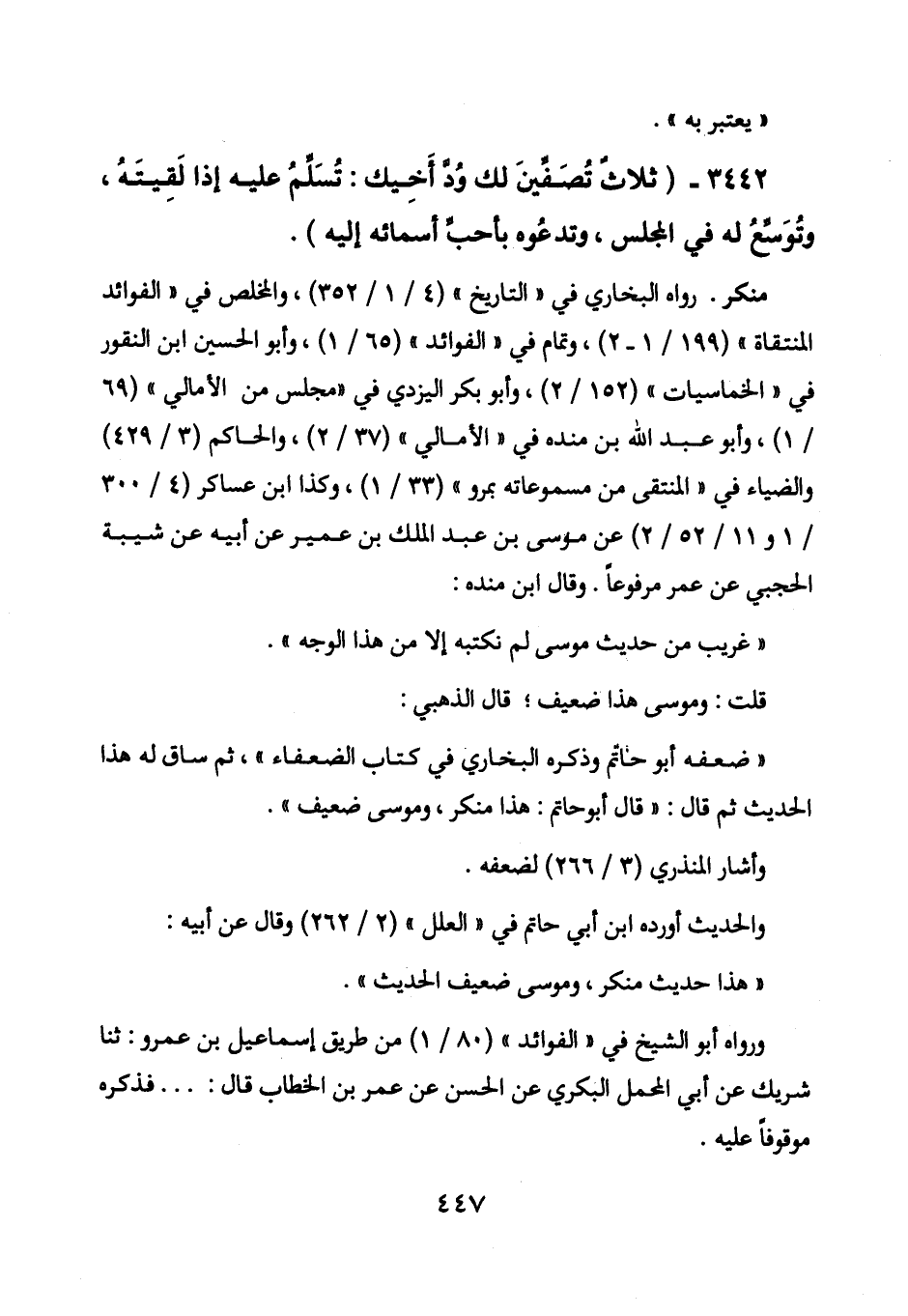 3442 - (ثلاث تُصَفِّينَ لك وُدَّ أخيك: تسلم عليه إذا لقيته، وتوسع له في المجلس، وتدعوه بأحب أسمائه إليه) .
