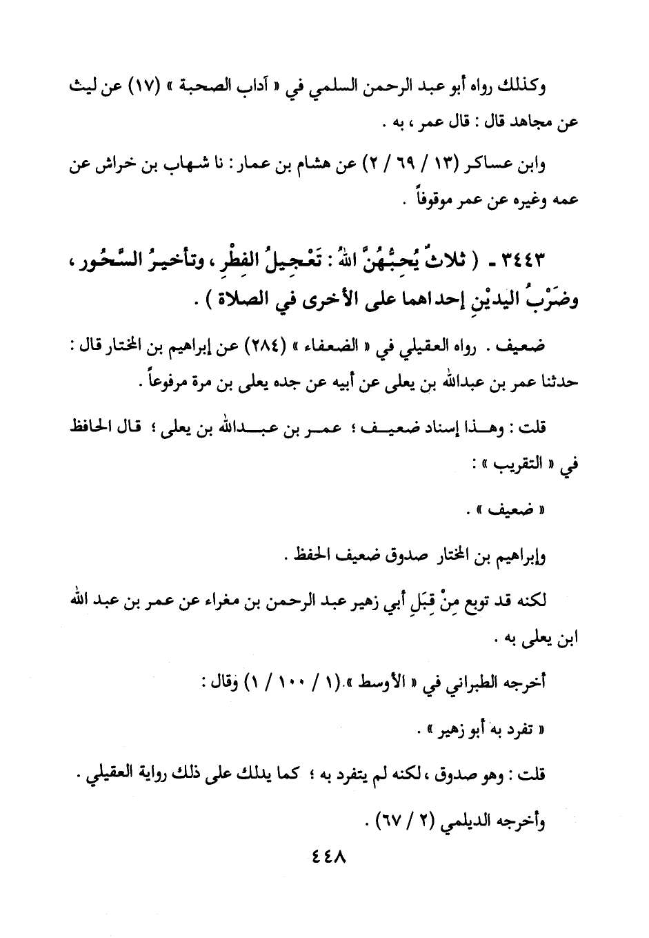 3443 - (ثلاث يحبهن الله: تعجيل الفطر، وتأخير السحور، وضرب اليدين إحداهما على الأخرى في الصلاة) .