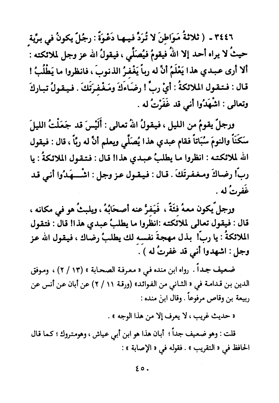 3446 - (ثلاثة مواطن لا ترد فيها دعوة: رجل يكون في برية حيث لا يراه أحد إلا الله فيقوم فيصلي، فيقول الله عز وجل لملائكته: ألا أرى عبد ي هذا يعلم أن له ربا يغفر الذنوب، فانظروا ما يطلب! قال: فيقول الملائكة: أي رب! رضاءك ومغفرتك. فيقول تبارك وتعالى: اشهدوا أني قد غفرت له.