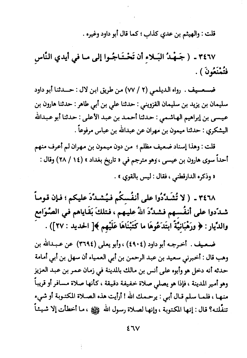 3468 - (لا تشددوا على أنفسكم فيشدد عليكم؛ فإن قوماً شددوا على أنفسهم فشدد الله عليهم، فتلك بقاياهم في الصوامع والديار: (ورهبانية ابتدعوها ما كتبناها عليهم) [الحديد: 27] ) .