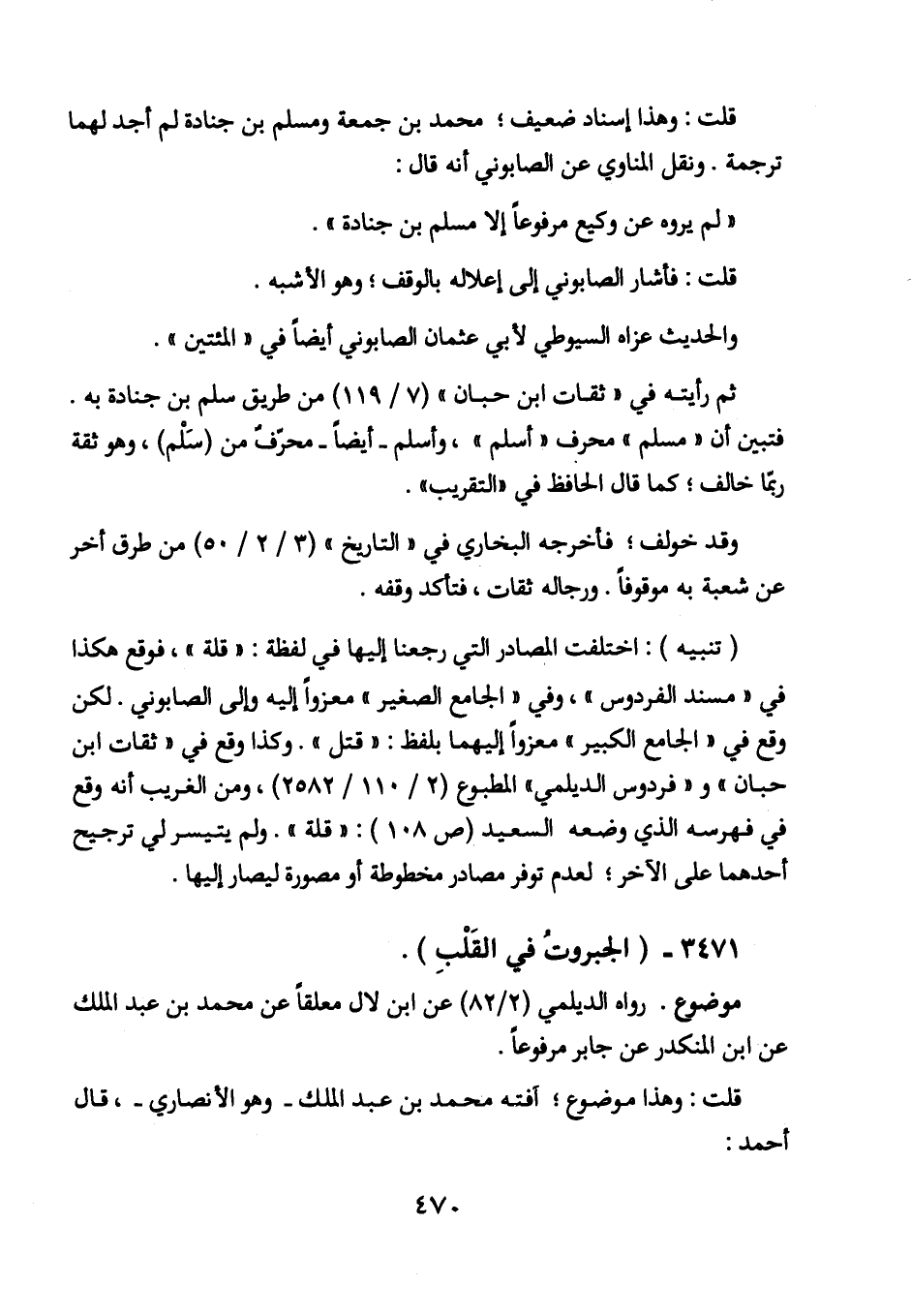 قلت: وهذا إسناد ضعيف؛ محمد بن جمعة ومسلم بن جنادة لم أجد لهما ترجمة. ونقل المناوي عن الصابوني أنه قال: