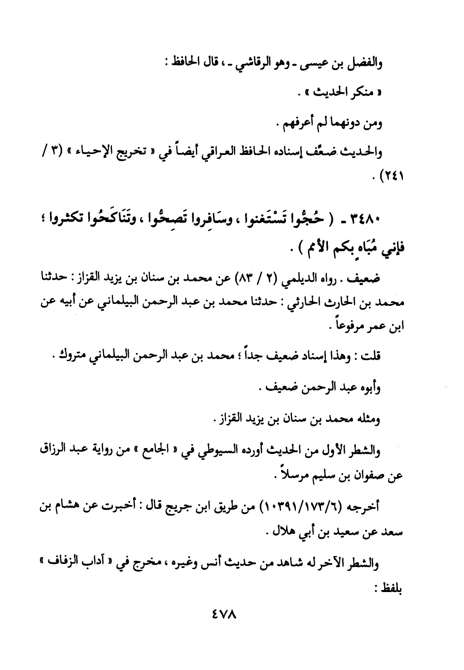 3480 - (حجوا تستغنوا، وسافروا تصحوا، وتناكحوا تكثروا؛ فإني مباه بكم الأمم) .