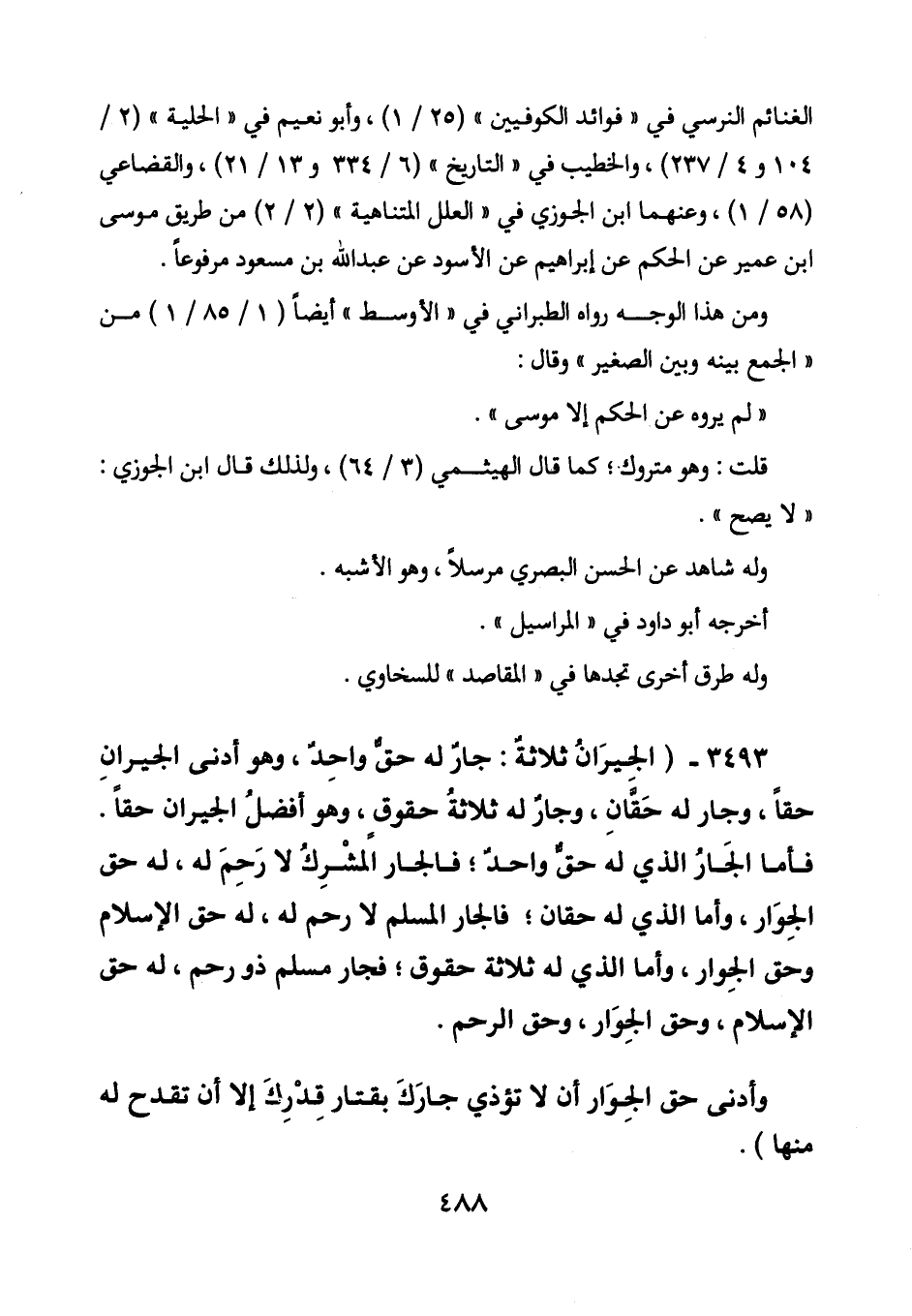 3493 - (الجيران ثلاثة: جار له حق واحد، وهو أدنى الجيران حقاً، وجار له حقان، وجار له ثلاثة حقوق، وهو أفضل الجيران حقاً. فأما الجار الذي له حق واحد؛ فالجار المشرك لا رحم له، له حق الجوار، وأما الذي له حقان؛ فالجار المسلم لا رحم له، له حق الإسلام وحق الجوار، وأما الذي له ثلاثة حقوق؛ فجار مسلم ذو رحم، له حق الإسلام، وحق الجوار، وحق الرحم.