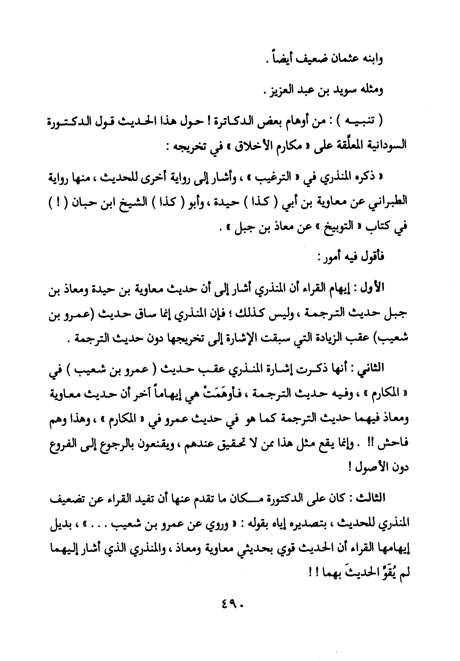 الثاني: أنها ذكرت إشارة المنذري عقب حديث (عمرو بن شعيب) في "المكارم"، وفيه حديث الترجمة، فأوهمت هي إيهاماً آخر أن حديث معاوية ومعاذ فيهما حديث الترجمة كما هو في حديث عمرو في "المكارم"، وهذا وهم فاحش!! . وإنما يقع مثل هذا ممن لا تحقيق عندهم، ويقنعون بالرجوع إلى الفروع دون الأصول!