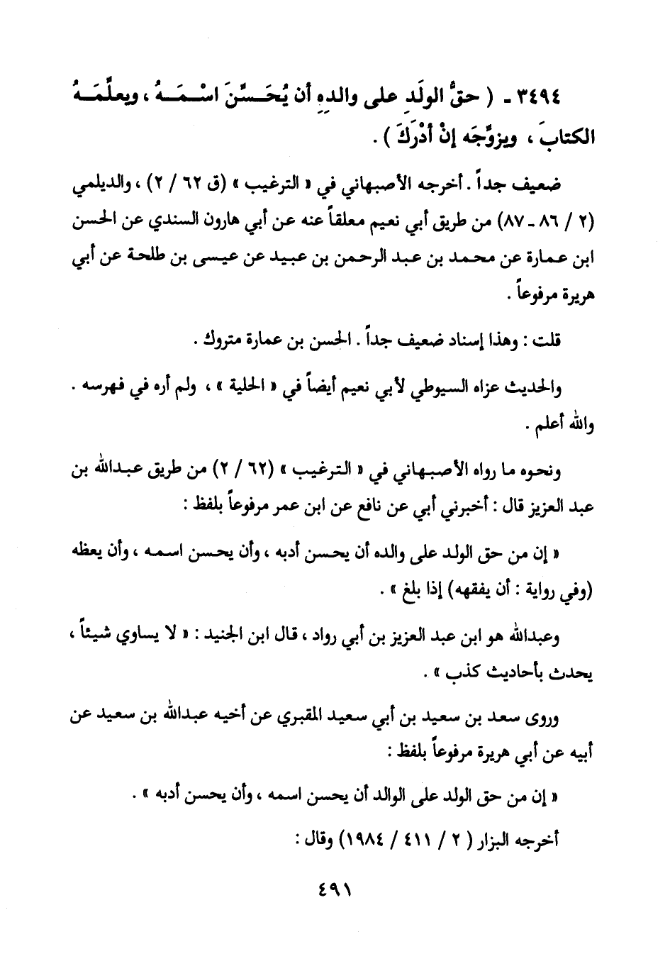 3494 - (حق الولد على والده أن يحسن اسمه، ويعلمه الكتاب، ويزوجه إن أدرك) .