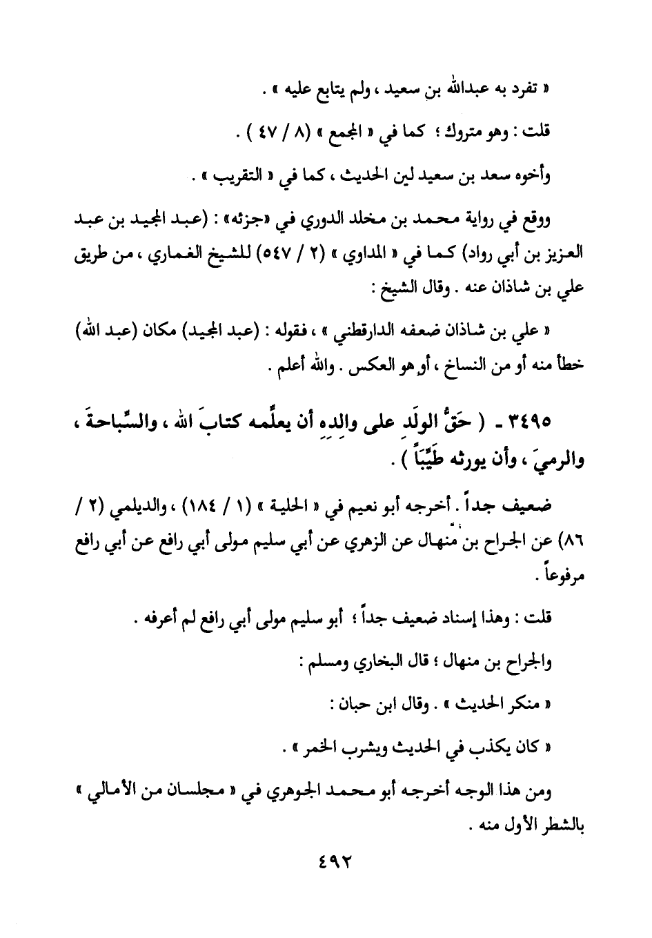 3495 - (حق الولد على والده أن يعلمه كتاب الله، والسباحة، والرمي، وأن يورثه طيباً) .