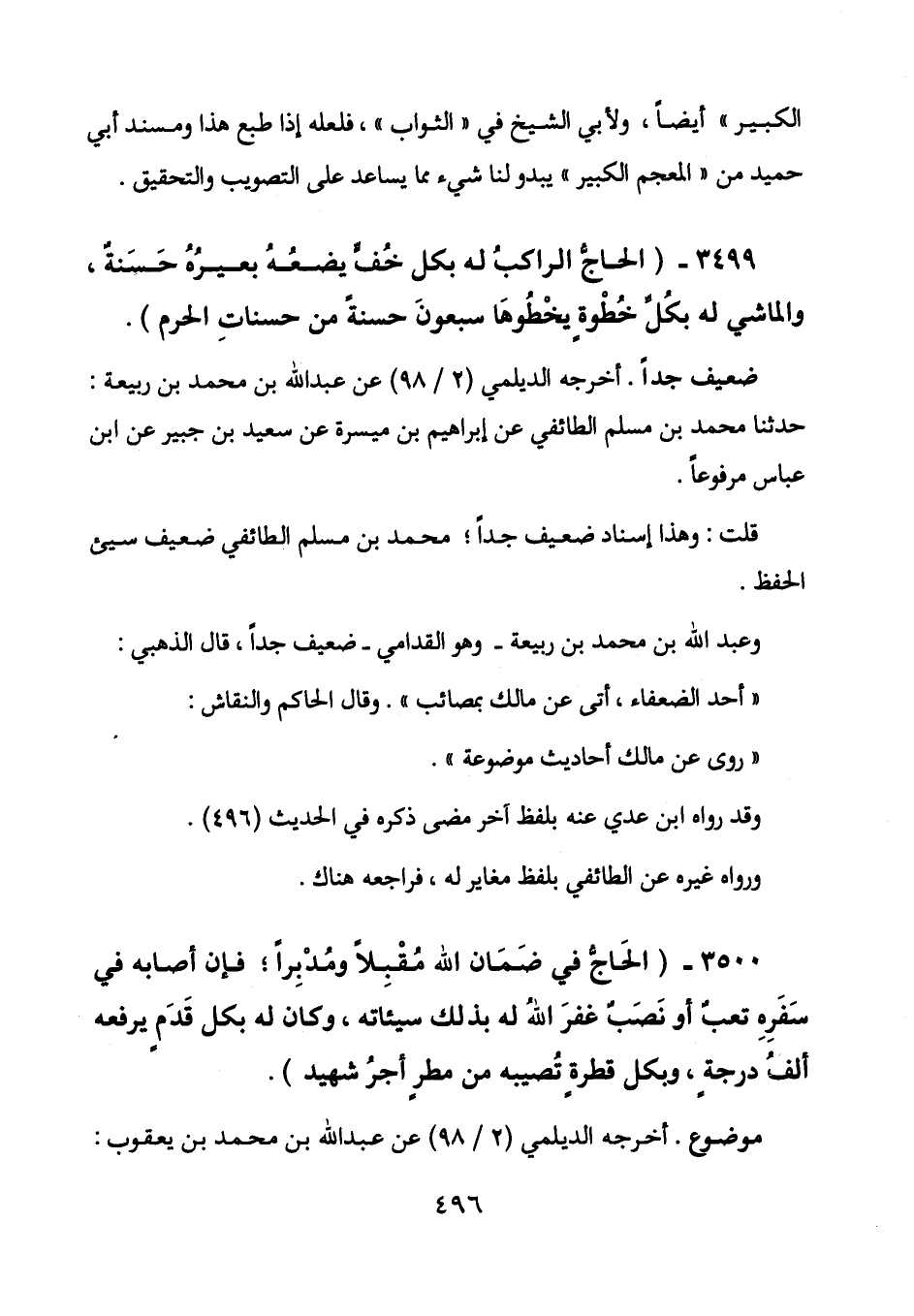 3499 - (الحاج الراكب له بكل خف يضعه بعيره حسنة، والماشي له بكل خطوة يخطوها سبعون حسنة من حسنات الحرم) .