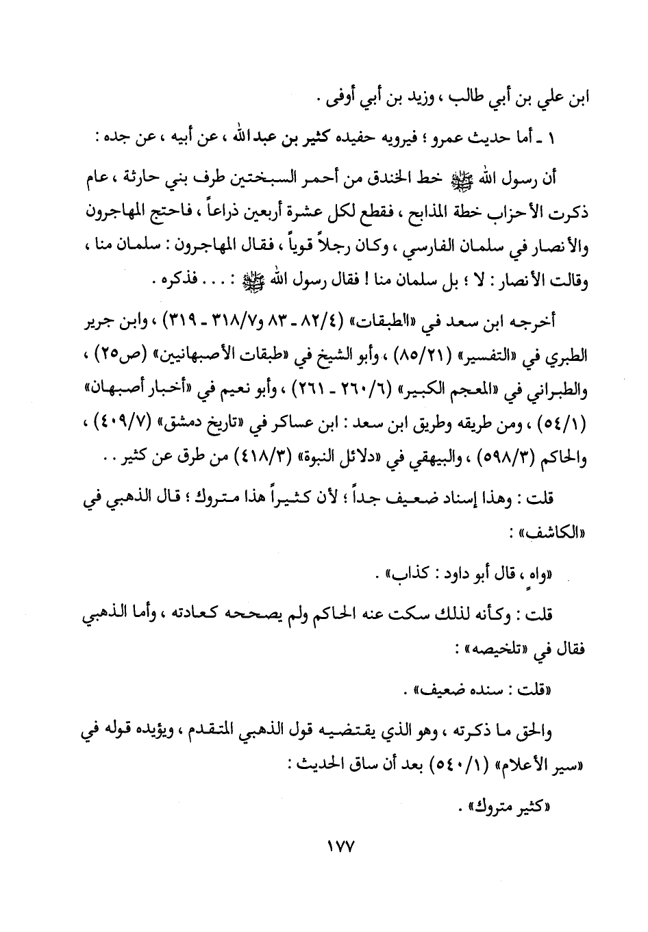 أن رسول الله - صلى الله عليه وسلم - خط الخندق من أحمر السبختين طرف بني حارثة، عام ذكرت الأحزاب خطة المذابح، فقطع لكل عشرة أربعين ذراعاً، فاحتج المهاجرون والأنصار في سلمان الفارسي، وكان رجلاً قوياً، فقال المهاجرون: سلمان منا، وقالت الأنصار: لا؛ بل سلمان منا! فقال رسول الله - صلى الله عليه وسلم -: ... فذكره.