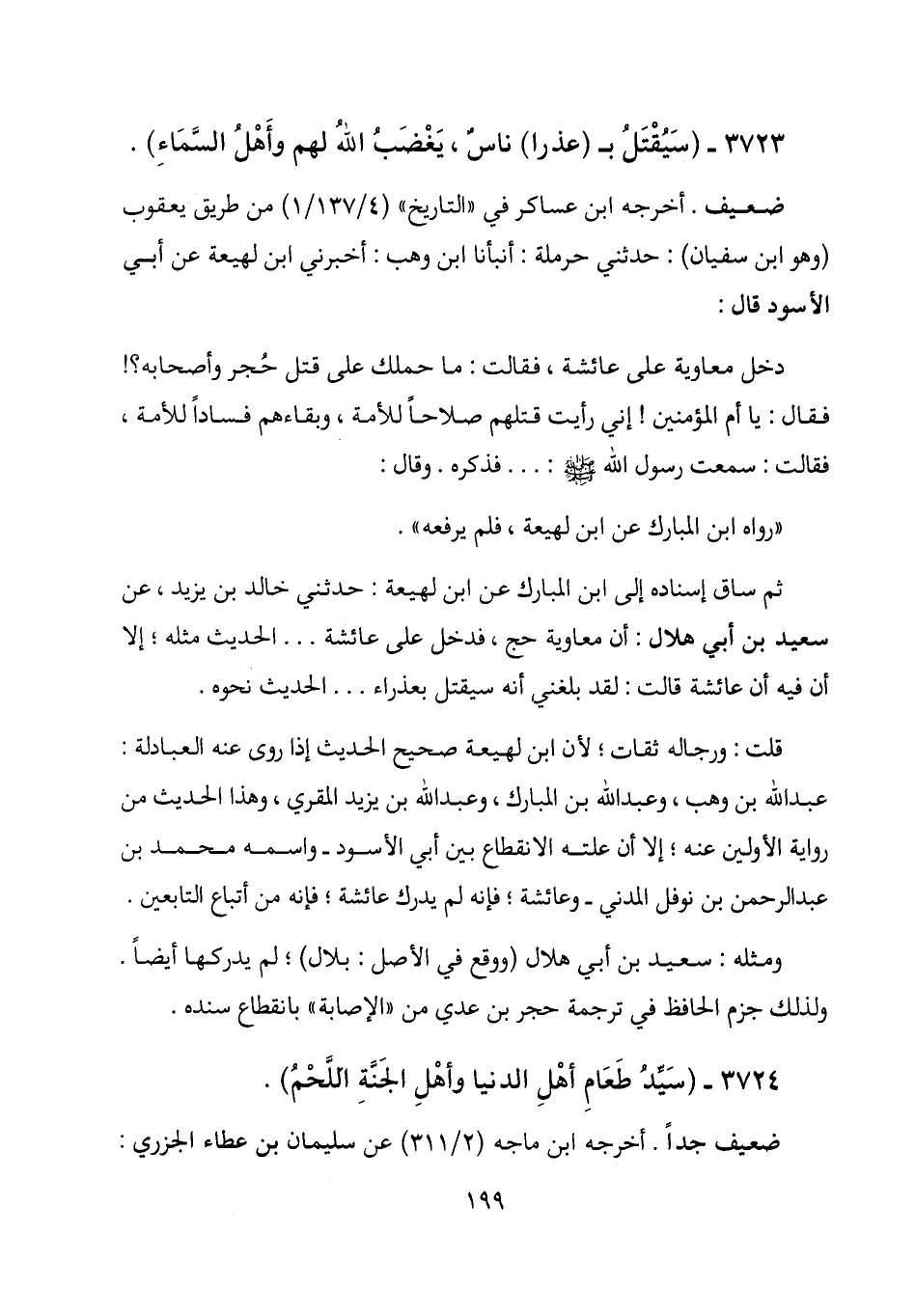 ومثله: سعيد بن أبي هلال (ووقع في الأصل: بلال) ؛ لم يدركها أيضاً. ولذلك جزم الحافظ في ترجمة حجر بن عدي من "الإصابة" بانقطاع سنده.