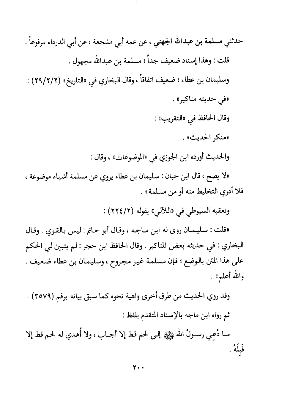 "قلت: سليمان روى له ابن ماجه، وقال أبو حاتم: ليس بالقوي. وقال البخاري: في حديثه بعض المناكير. وقال الحافظ ابن حجر: لم يتبين لي الحكم على هذا المتن بالوضع؛ فإن مسلمة غير مجروح، وسليمان بن عطاء ضعيف. والله أعلم.