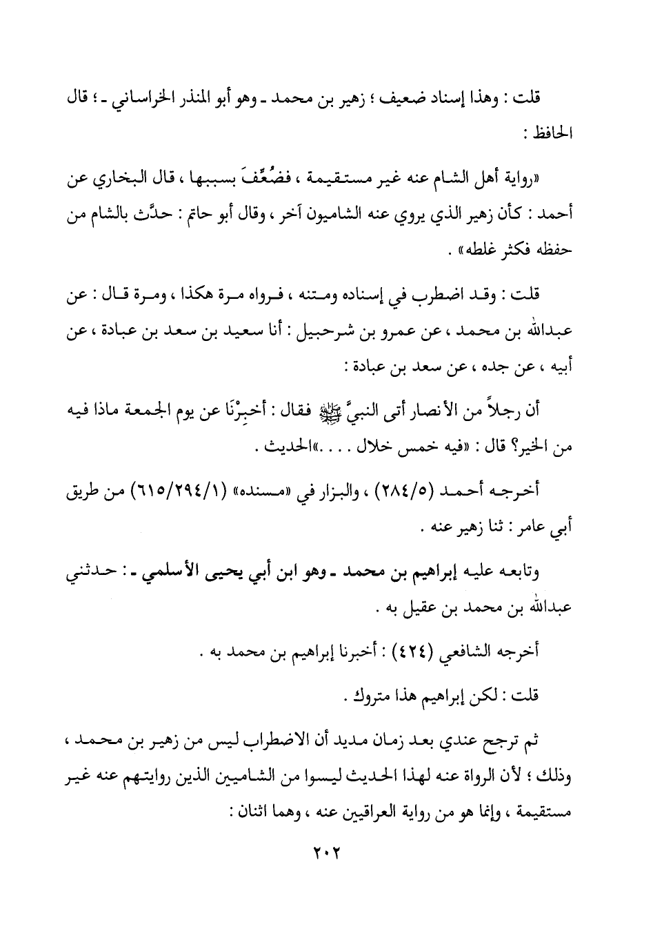ثم ترجح عندي بعد زمان مديد أن الاضطراب ليس من زهير بن محمد، وذلك؛ لأن الرواة عنه لهذا الحديث ليسوا من الشاميين الذين روايتهم عنه غير مستقيمة، وإنما هو من رواية العراقيين عنه، وهما اثنان: