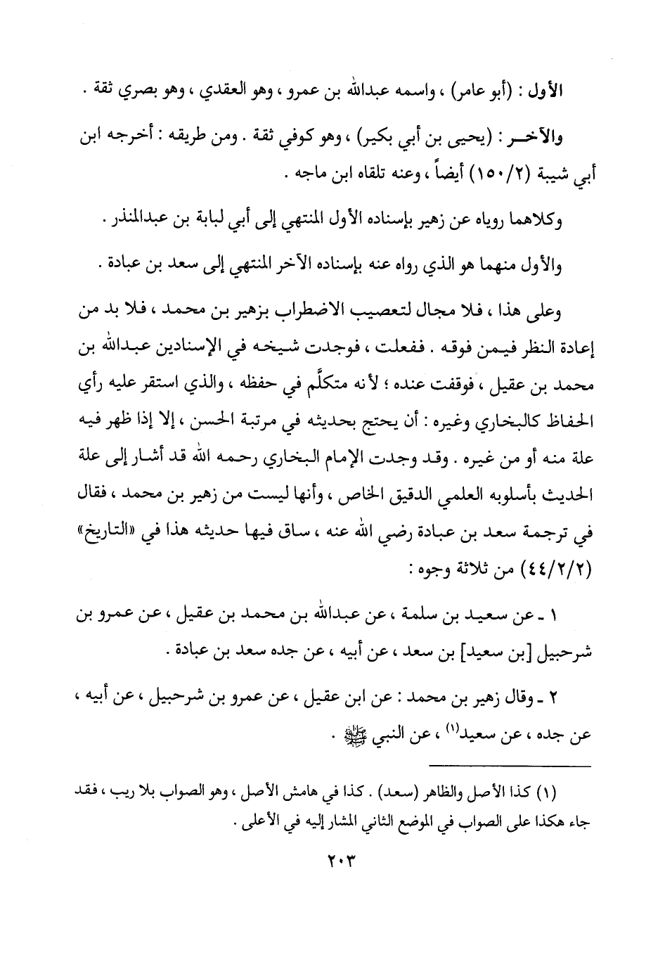 وعلى هذا، فلا مجال لتعصيب الاضطراب بزهير بن محمد، فلا بد من إعادة النظر فيمن فوقه. ففعلت، فوجدت شيخه في الإسنادين عبد الله بن محمد بن عقيل، فوقفت عنده؛ لأنه متكلم في حفظه، والذي استقر عليه رأي الحفاظ كالبخاري وغيره: أن يحتج بحديثه في مرتبة الحسن، إلا إذا ظهر فيه علة منه أو من غيره. وقد وجدت الإمام البخاري رحمه الله قد أشار إلى علة الحديث بأسلوبه العلمي الدقيق الخاص، وأنها ليست من زهير بن محمد، فقال في ترجمة سعد بن عبادة رضي الله عنه، ساق فيها حديثه هذا في "التاريخ" (2/ 2/ 44) من ثلاثة وجوه: