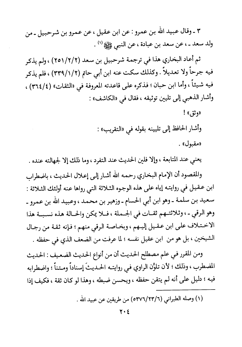 والمقصود أن الإمام البخاري رحمه الله أشار إلى إعلال الحديث، باضطراب ابن عقيل في روايته إياه على هذه الوجوه الثلاثة التي رواها عنه أولئك الثلاثة: سعيد بن سلمة - وهو ابن أبي الحسام - وزهير بن محمد، وعبيد الله بن عمرو - وهو الرقي -، وثلاثتهم ثقات في الجملة، فلا يمكن والحالة هذه نسبة هذا الاختلاف على ابن عقيل إليهم، وبخاصة الرقي منهم؛ فإنه ثقة من رجال الشيخين، بل هو من ابن عقيل نفسه؛ لما عرفت من الضعف الذي في حفظه.