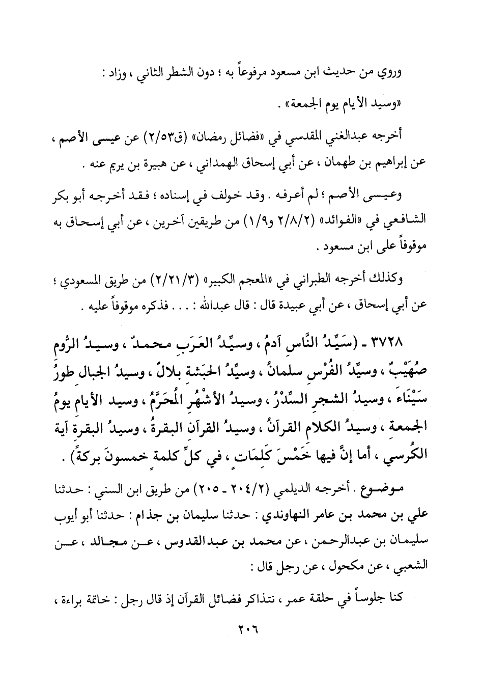 3728 - (سيد الناس آدم، وسيد العرب محمد، وسيد الروم صهيب، وسيد الفرس سلمان، وسيد الحبشة بلال، وسيد الجبال طور سيناء، وسيد الشجر السدر، وسيد الأشهر المحرم، وسيد الأيام يوم الجمعة، وسيد الكلام القرآن، وسيد القرآن البقرة، وسيد البقرة آية الكرسي، أما إن فيها خمس كلمات، في كل كلمة خمسون بركة) .