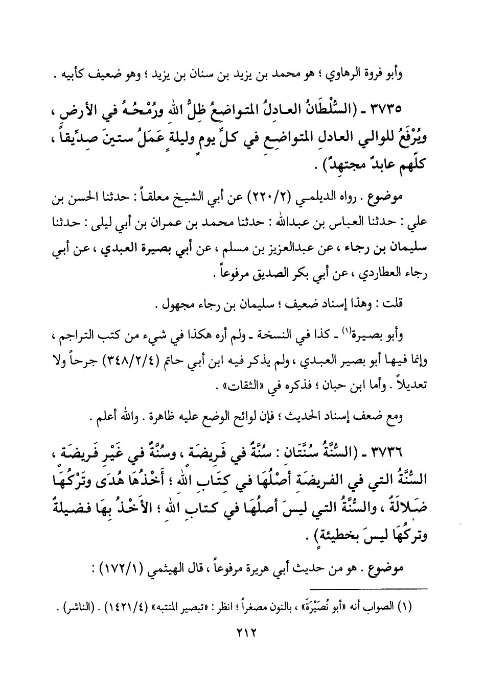 3735 - (السلطان العادل المتواضع ظل الله ورمحه في الأرض، ويرفع للوالي العادل المتواضع في كل يوم وليلة عمل ستين صديقاً، كلهم عابد مجتهد) .