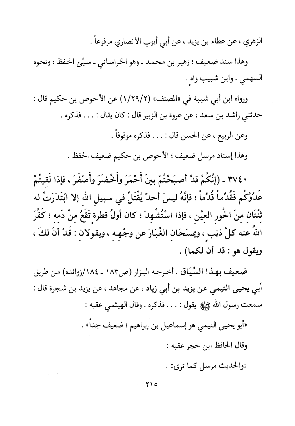 3740 - (إنكم قد أصبحتم بين أحمر وأخضر وأصفر، فإذا لقيتم عدوكم فقدماً قدماً؛ فإنه ليس أحد يقتل في سبيل الله إلا ابتدرت له ثنتان من الحور العين، فإذا استشهد؛ كان أول قطرة تقع من دمه؛ كفر الله عنه كل ذنب، ويمسحان الغبار عن وجهه، ويقولان: قد آن لك، ويقول هو: قد آن لكما) .