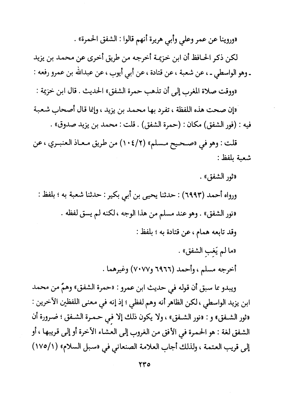 ويبدو مما سبق أن قوله في حديث ابن عمرو: "حمرة الشفق" وهم من محمد ابن يزيد الواسطي، لكن الظاهر أنه وهم لفظي؛ إذ أنه في معنى اللفظين الآخرين: "ثور الشفق" و: "نور الشفق"، ولا يكون ذلك إلا في حمرة الشفق؛ ضرورة أن الشفق لغة: هو الحمرة في الأفق من الغروب إلى العشاء الآخرة أو إلى قريبها، أو إلى قريب العتمة، ولذلك أجاب العلامة الصنعاني في "سبل السلام" (1/ 175)