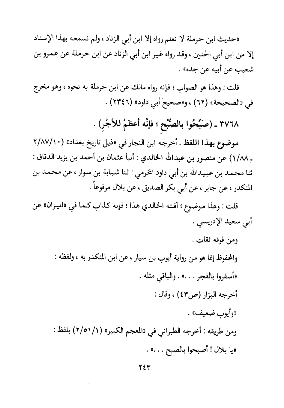 "حديث ابن حرملة لا نعلم رواه إلا ابن أبي الزناد، ولم نسمعه بهذا الإسناد إلا من ابن أبي الحنين، وقد رواه غير ابن أبي الزناد عن ابن حرملة عن عمرو بن شعيب عن أبيه عن جده".